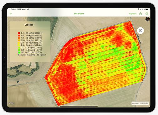 En effet avec EXO.EXPERT, la cartographie par drone et l’analyse de la biomasse (NDVI) offrent une vision précise de la santé des cultures. Les cartes interactives identifient les zones de fort et faible potentiel pour des interventions ciblées (fertilisation, irrigation), une réduction des intrants et une meilleure anticipation des rendements.